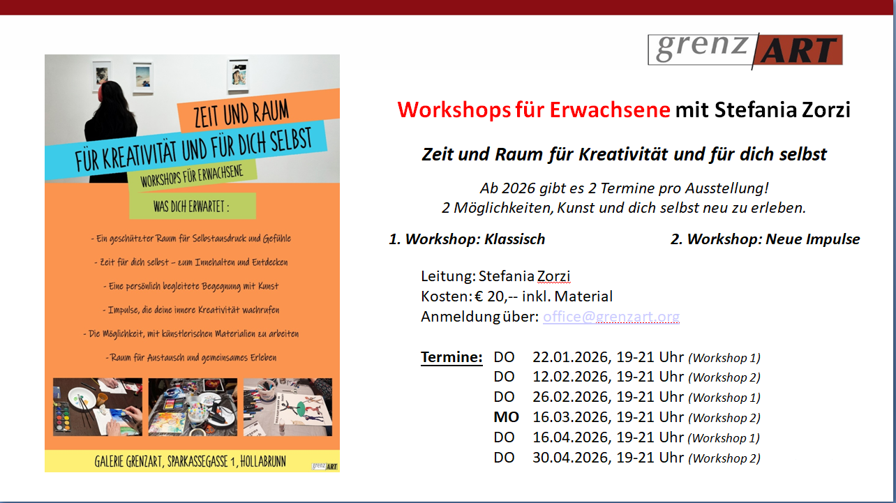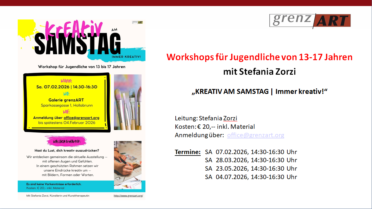 - Kreativ am Samstag – Workshop für Jugendliche von 13-17 Jahren mit Stefania Zorzi, Künstlerin und Kunsttherapeutin